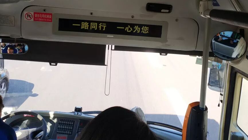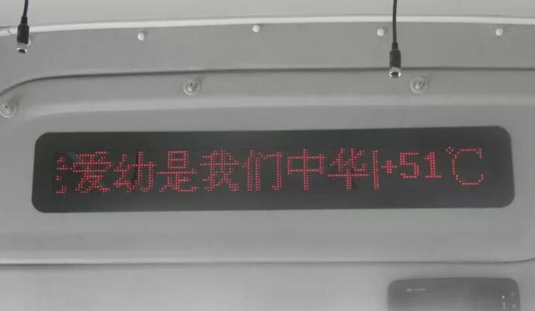 很多客车生产商都会在一个全车乘客都看得到的位置放置横向的 LED 显示屏,采用点阵宋体显示滚动通知,或者起到报站的作用。不过因为报站主要用语音,所以这块屏幕的意义不大,而且往往呈现的是没来得及更新的旧信息。