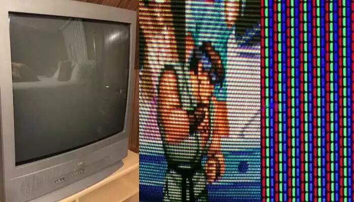 拿着放大镜贴上去观看,这样的屏幕在开启或关闭时,像素点之间能依稀看到一个一个蜂巢状的网眼,这就是显像管电视中重要的构成元素——荫罩(Shadow Mask)。这是一层凿出很多细小洞洞的钢板,目的是防止画面偏色或者重影。