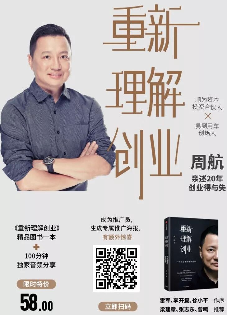 限时特价58元,包含“《重新理解创业》精品图书一本+100分钟干货音频”,扫描二维码即可购买,也可扫描后点击右上角“赚14.5元”,生成专属推广员海报分享给好友,每次成功邀请购买即可获得14.5元奖励金。奖励金可自助提现到微信钱包内。
