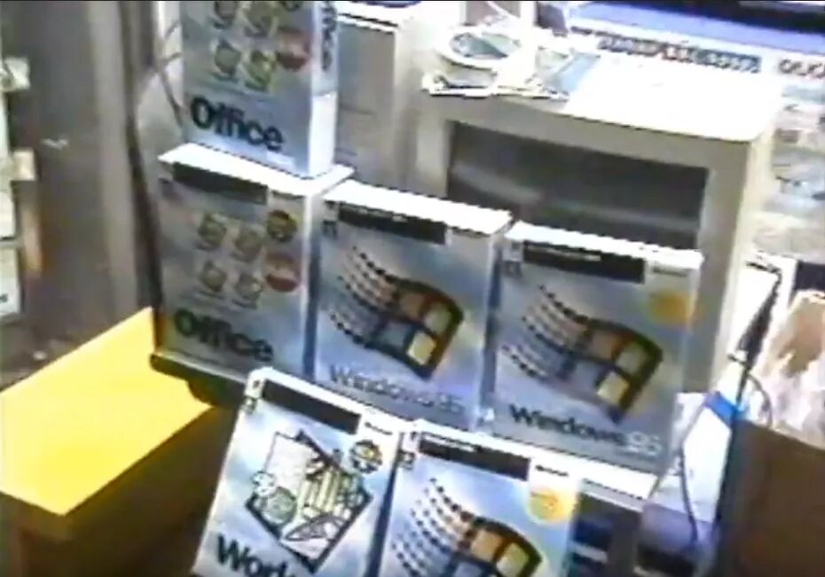 在 1995 年的东京秋叶原,消费者们一等 0 点钟声敲响就涌入电器行,同时抱着两个画着蓝天白云的大纸盒子出来,一个上面是 Windows 飞翔的窗口,一个是 Office 95 的七巧板。