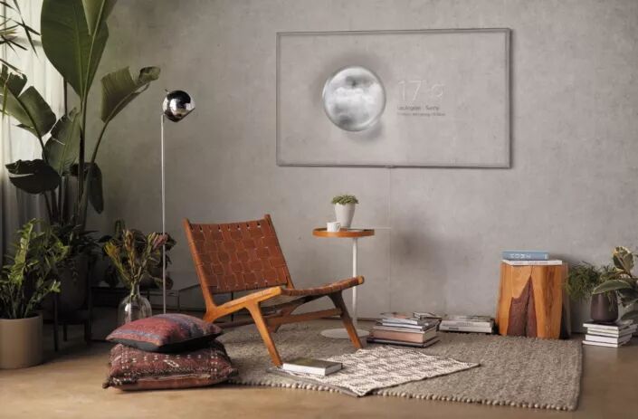在“环境屏”模式下,可以显示时钟、新闻、天气等信息,就像是从墙壁上“长”出字来。为了让效果更逼真,电视还支持环境光检测,也就是根据环境光线强度自动调整图像亮度。