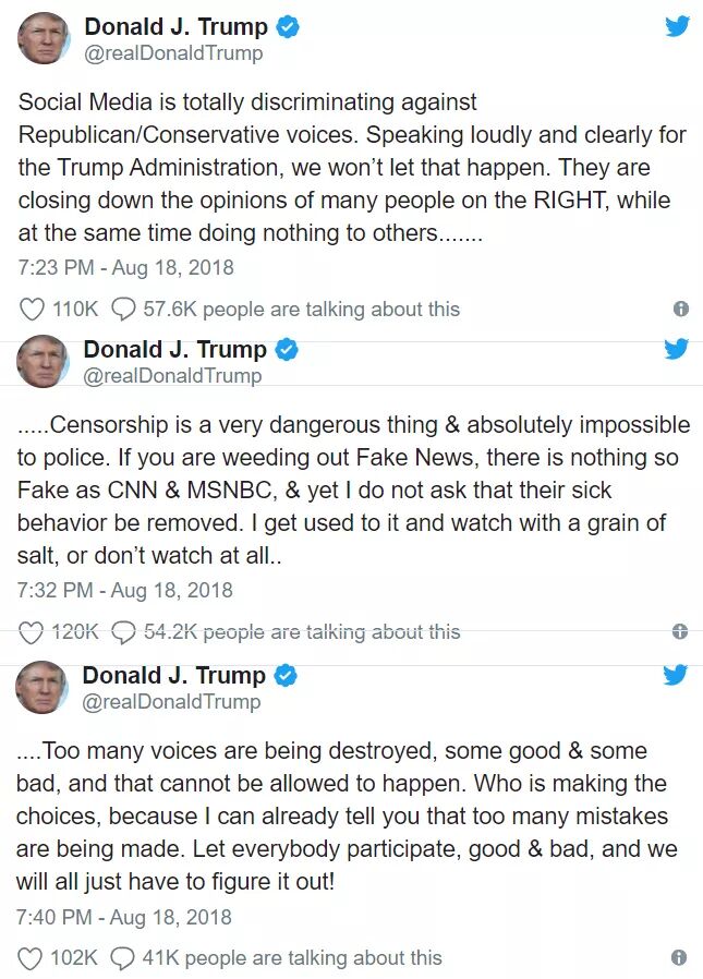 此后,美国总统特朗普也发推关注事件。他不点名地指责社交平台“完全歧视”保守派的声音,并称审查是“非常危险的事情”。他说,虽然他经常被 CNN 和 MSNBC 发布的“假新闻”激怒,但他并没有“要求他们停止病态行为”,而是“带着嘲讽去看或者压根就不看“。他希望“让所有人参与进来,不管是好是坏”。[9]