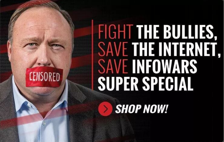 “与恶霸作斗争,挽救互联网,挽救超级特别的 Infowars,快来购物吧!”