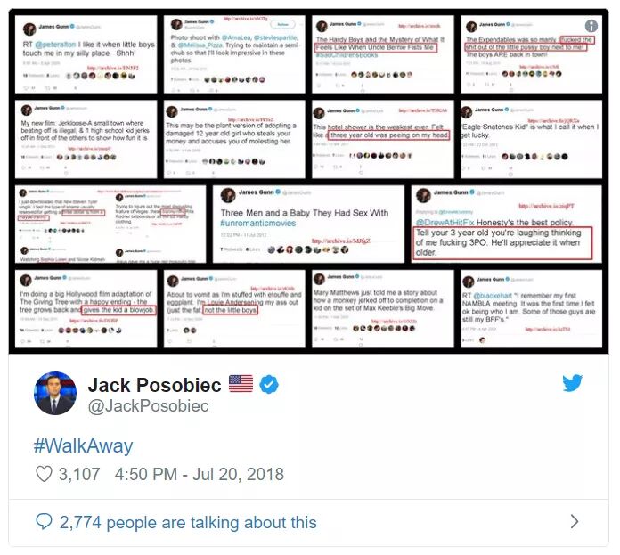 迪士尼热播剧目《银河护卫队》系列的导演冈恩(James Gunn)十年前也曾在 Twitter 发过此类笑话。非常不幸的是,有人把这些陈年旧事翻了出来。由于显而易见的涉及到恋童癖和强奸的不雅言论,冈恩随即成为众矢之的。