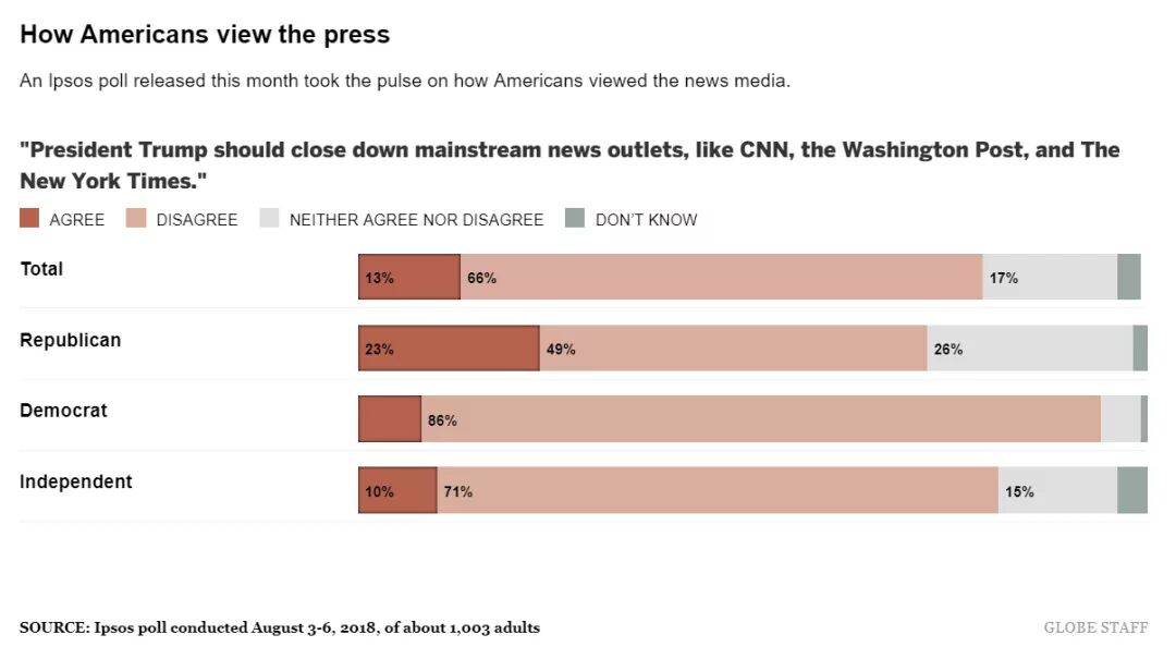 也是在去年 8 月中旬,《波士顿环球报》引用民调机构益普索(Ipsos)的调查显示,超过 1/4 的美国人不反对特朗普总统关闭 CNN、华盛顿邮报、纽约时报等“主流媒体”。[19]