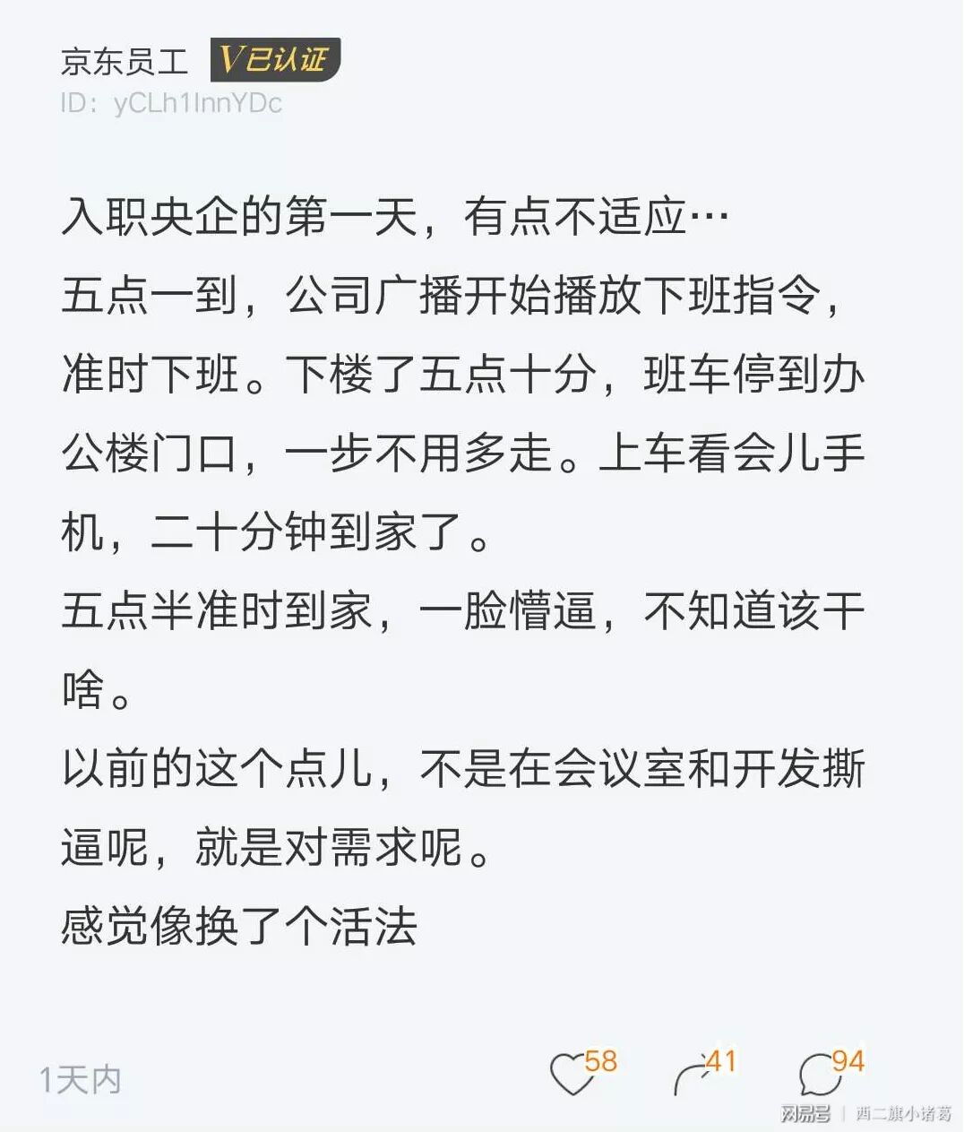 昨天有一个段子,某位在脉脉上面标注自己是前京东员工的人,说入职了一家央企,第一次感受到 5:00 整准时下班,10 分钟以后办公室都没人了是什么滋味;提早几个小时回到家中,那种巨大的空虚感幸福得让人猝不及防。现在已经不是炫富了,而是炫下班时间。[1]