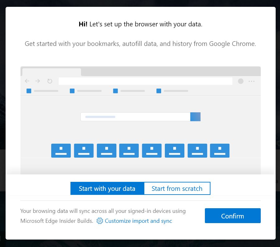 新的Edge同步各种浏览器信息,是使用你的微软账号而不是谷歌账号。在第一次启动浏览器的时候,Edge可以经过你的授权,自动的检测你已经安装在电脑上的Chrome,并完全导入其中的收藏夹、自动填充信息和浏览历史。