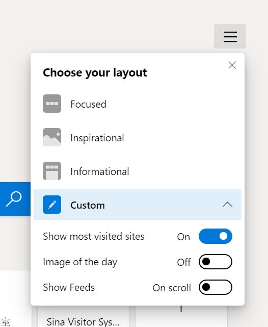 在启动页面可以选择三种不同的风格。除了在现有的Edge已经实现的纯搜索框、常用网址和资讯瀑布流之外,还可以选择加载来自必应(bing)的壁纸。很多网友会下载专门的插件让自己的浏览器首页每天都能加载必应美图,而选择Edge可以自动帮你实现这一愿望。