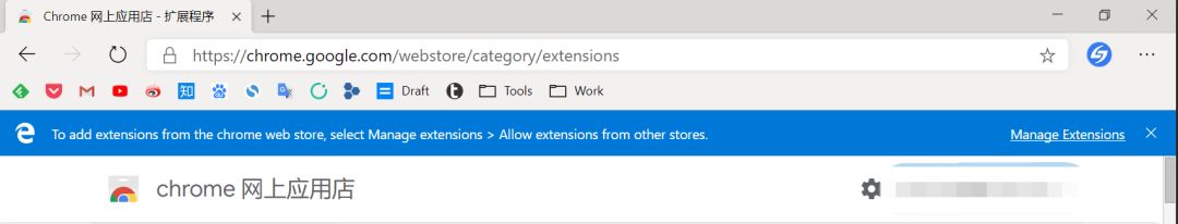 因此在这一版本的Edge上面可以随意安装来自Chrome应用店的插件。Edge会自动检测到你访问了谷歌商店,并且提示你要安装的话,需要到扩展管理页面去打开安装第三方插件的开关。