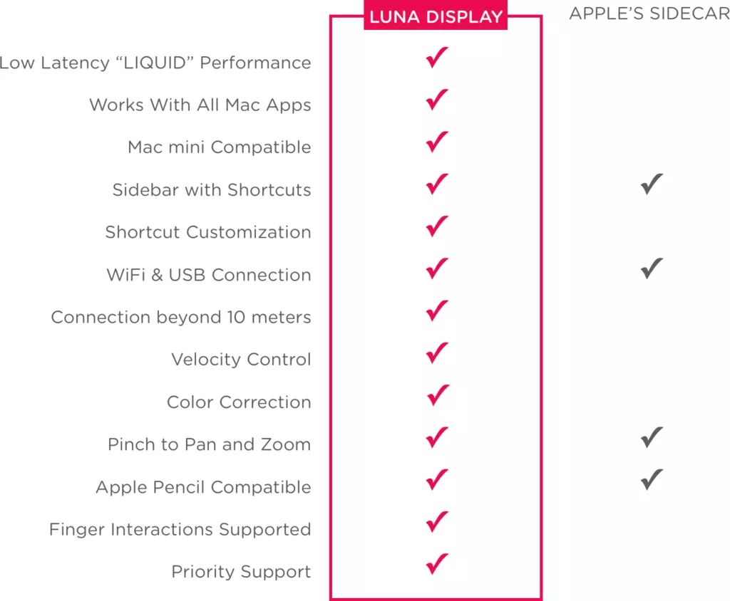 在 Sidecar 公布之后,同样做 iPad 副屏显示的 Luna Display 发布了功能对比表格 [10] ,劝告付费用户:“我们不是给所有人准备的。但如果你是专业人士,我们会满足你的需要。”