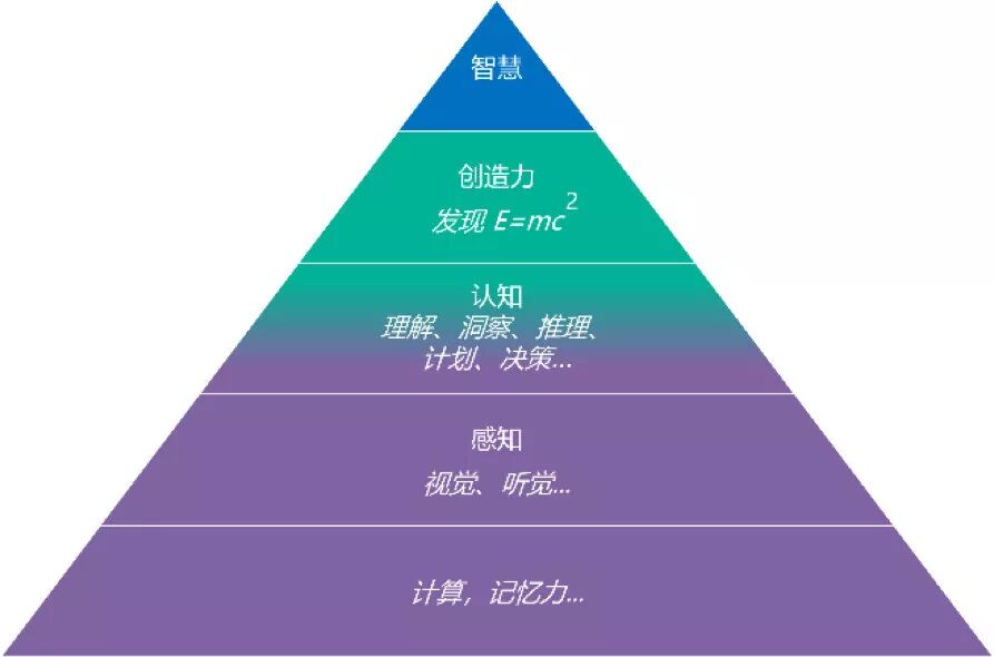 洪小文把人类定义的“智能”画成一个金字塔,自底至上依次是:计算和记忆、感知(视觉、听觉)、认知(理解、洞察、推理、计划、决策等)、创造力(发现科学原理)和智慧。越往上,就越复杂,越接近智慧本身。