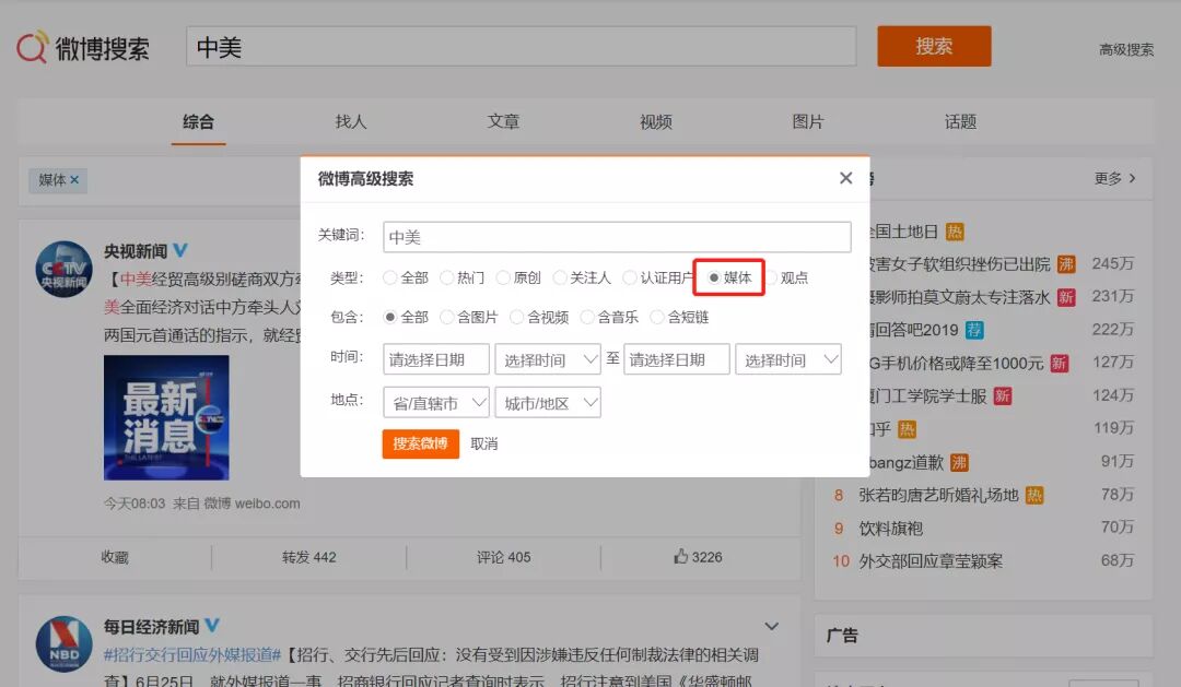 大约在 5 月底 6 月初,微博搜索网页版的“高级搜索”加入了专门检索“媒体”和“观点”的两个选项,这让查询媒体发布的图文和视频变得更为精准。