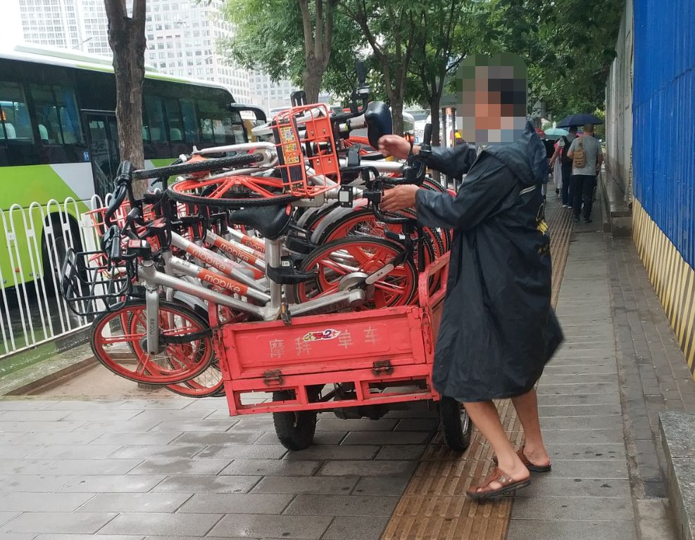 那小黄车呢?它在北京已经基本绝迹,(原)运维人员也在“倒戈”。6 月 13 日,我设法拍了一张穿着黑底黄字 ofo 雨衣的工人,在朗家园帮摩拜挪车的照片: