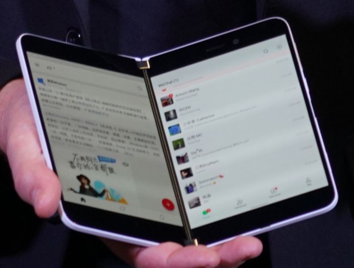 现场展示的 Surface Duo 手机同时打开了微博国际版和微信界面,与其它 Android 手机并无二致。