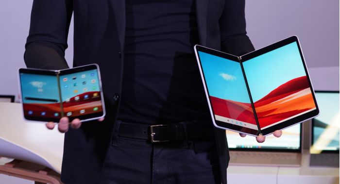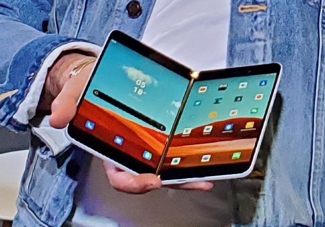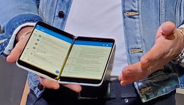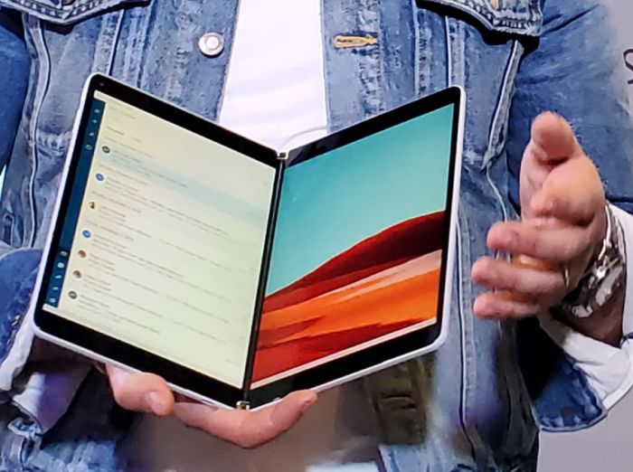 和美国发布会一样,两款设备都只是由 Panos 端着给大家拍照,不能近距离触摸,也不能看到大家一直很想看的 Windows 10 X 资源管理器(据说经过重新设计;而网上现存的图都是假的)。