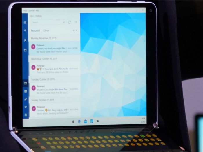 至于 Surface Neo 双屏电脑则展示了基于 UWP 的“邮件”应用,界面上 Windows 10 X 的任务栏、底部实体键盘上面的 Wonderbar(在聊天界面显示表情、GIF 等内容)清晰可见。