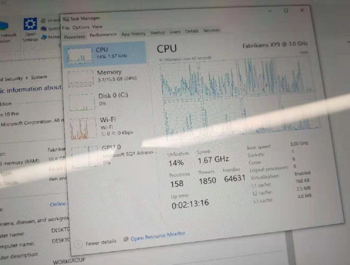 Surface Pro X采用微软与高通合作开发的SQ1处理器(工程机未显示型号),图形处理能力可实现高达每秒2万亿次的浮点运算,而电池使用时间长达13小时。