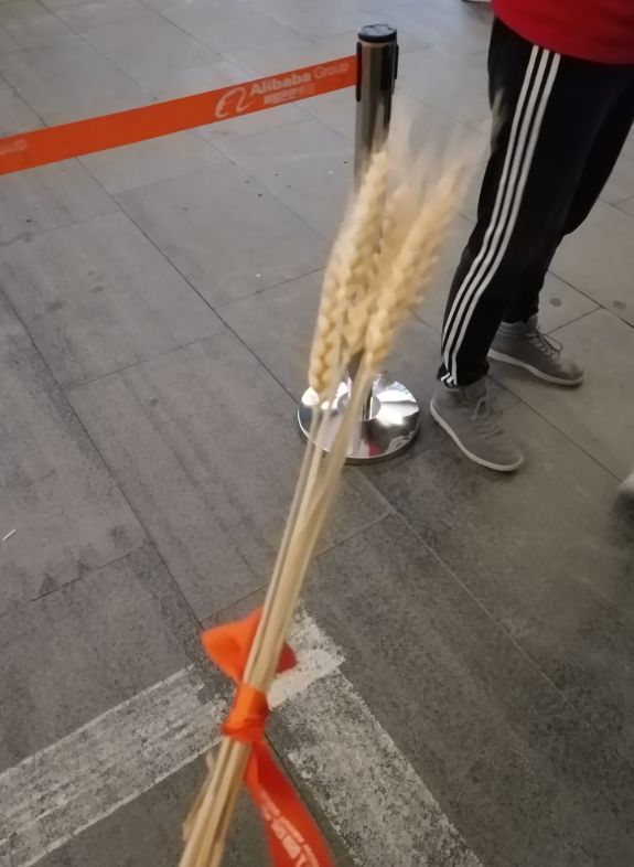 今年双11有很多充满双关寓意的吉祥物件,这株大麦就是一例,每个进门的人都会分到一枝,但我们实在不太清楚把它放哪里合适,走着走着就掉到地下了。在阿里员工餐厅有人负责看到地上掉下的麦穗就捡起来。