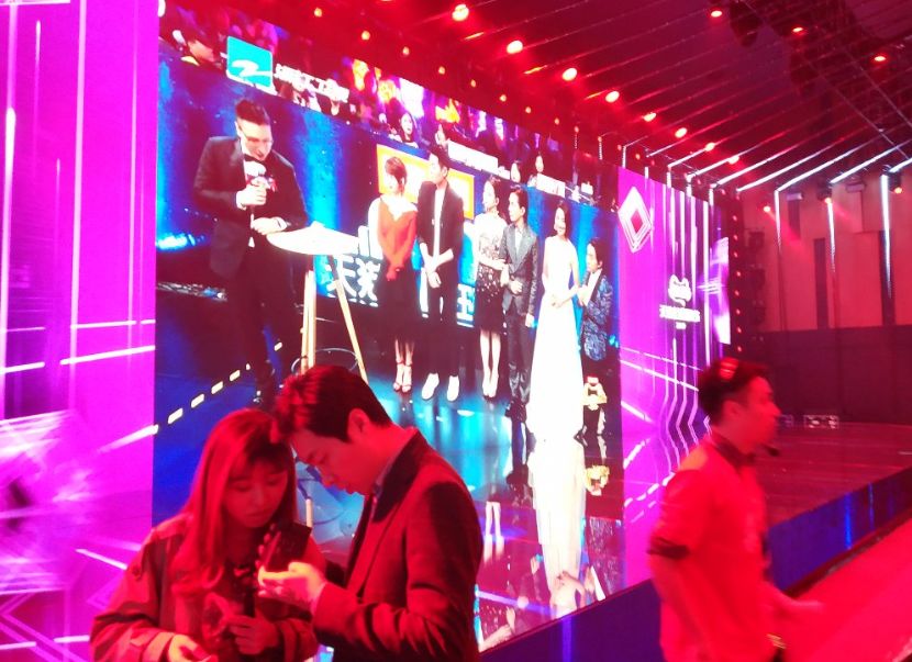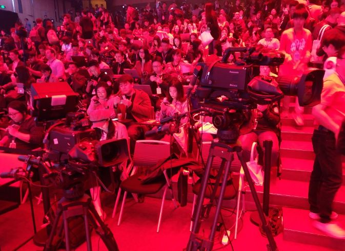 跟前两届在猫晚场地梅赛德斯奔驰文化中心旁边的世博中心设置的大型媒体区相比,用园区报告厅临时搭建起来的场地小了好多,但前来的记者数量却有增无减。