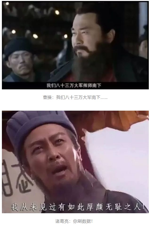 总的来说,中国历史中的数量记载,总有一种时准时不准的状态。有时候看上去非常合理……但有时候又注水的非常厉害。让刷量在民间深入人心的,是明清小说。尽管在作为正史的《三国志》里,明确记载了曹操南下的军队数量是20万。然后经过三国演义的洗脑,曹操八十三万大军下江南这个概念深入人心,再也没有人记得20万这个数字。这一批文艺作品对中国民间文化的影响很深,奠定了中国人一个重要观念:即中国历史上的“头部战役”,应该是十万为单位展开。少于十万的参战数量,都是不入流的“腰尾部战役”。子宇爸爸,公众号:大家张子宇丨几千年来,你们刷过的流量还少吗