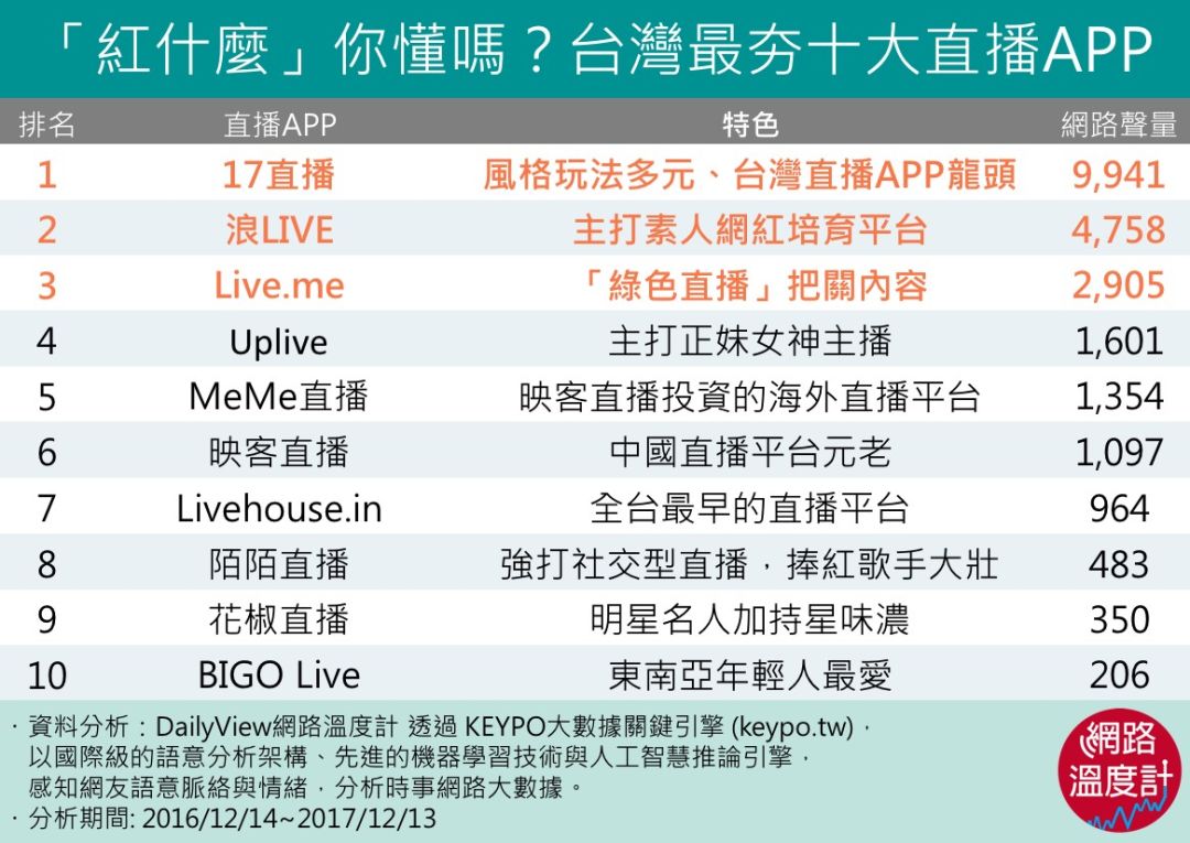 首先让我们回到风起云涌的 2017 年,这是台湾本地媒体制作的 2017 全年最热的直播 App 榜单: