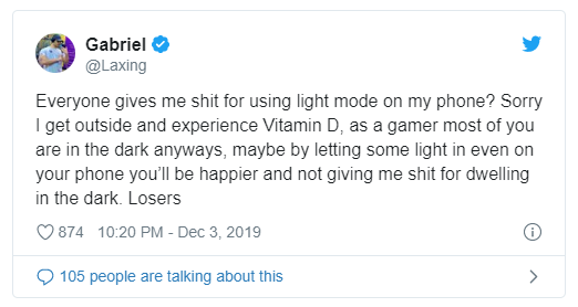 甚至如果有的人,或者有的应用无法切换到黑色模式,还会遭到嘲笑。Mashable 的文章里提到,下面这位电竞选手就因为使用亮色模式受到了来自亲友的暴击。