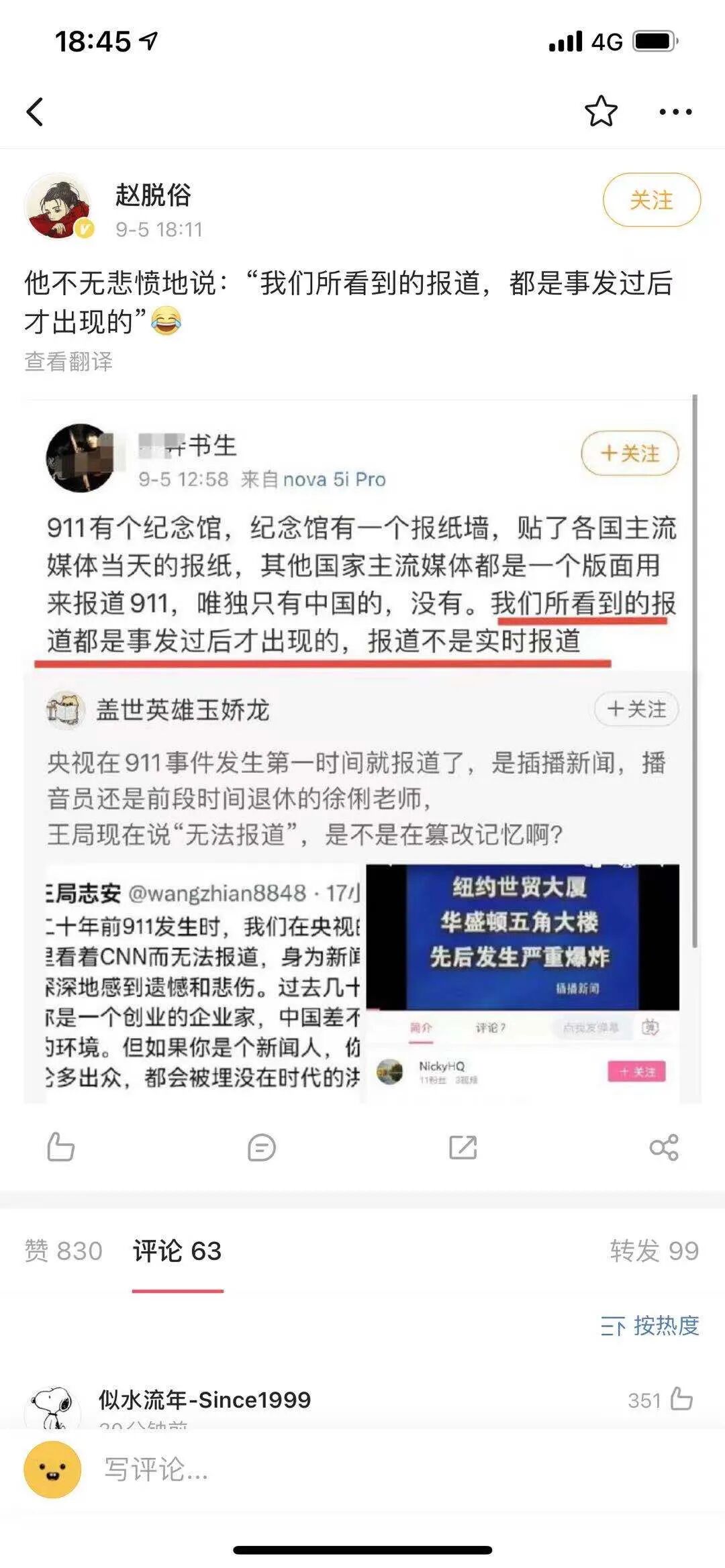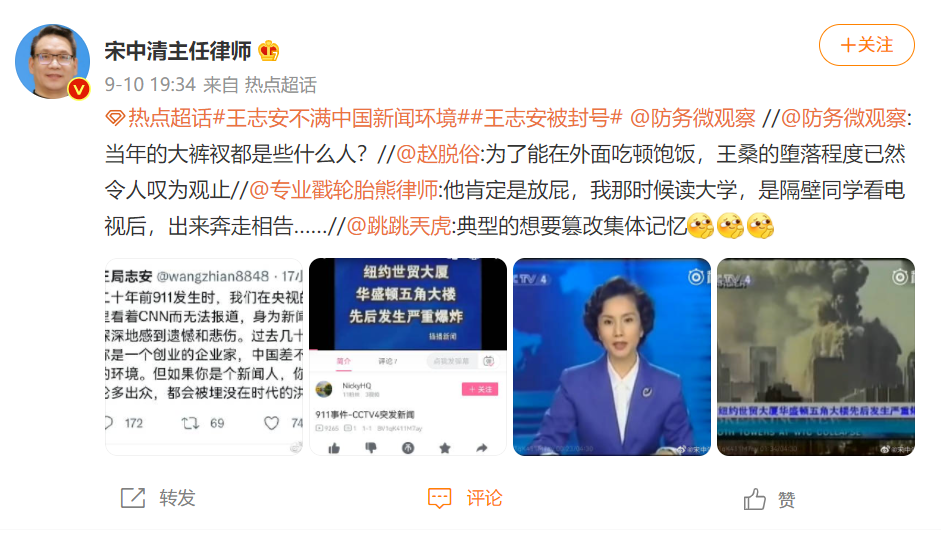 无需列举更多事例,我们就能发现微博上针对王志安批评的奇怪之处。“我那时候读大学,是隔壁同学看电视后,出来奔走相告”的情况至少应该发生在第二天上午,或者学校可能在上海,或者同学们用某种方法看到了凤凰台。