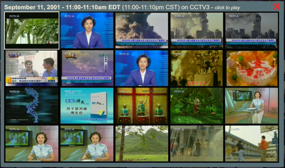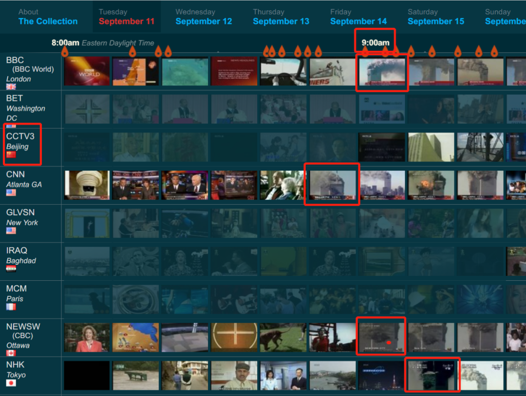2011年,有人用上文提到的“互联网档案馆”存档完成了一项媒体研究,数了数主要电视台显示飞机失事、建筑物倒塌和人们从塔楼坠落画面的次数。CNN从21:00到次日12:00(当地时间09:00-午夜)播放了109次飞机失事画面,大约每8分钟一次;播放塔楼倒塌161次,大约每5分钟一次。BBC播放飞机撞向塔楼画面240次,大约不到4分钟一次。