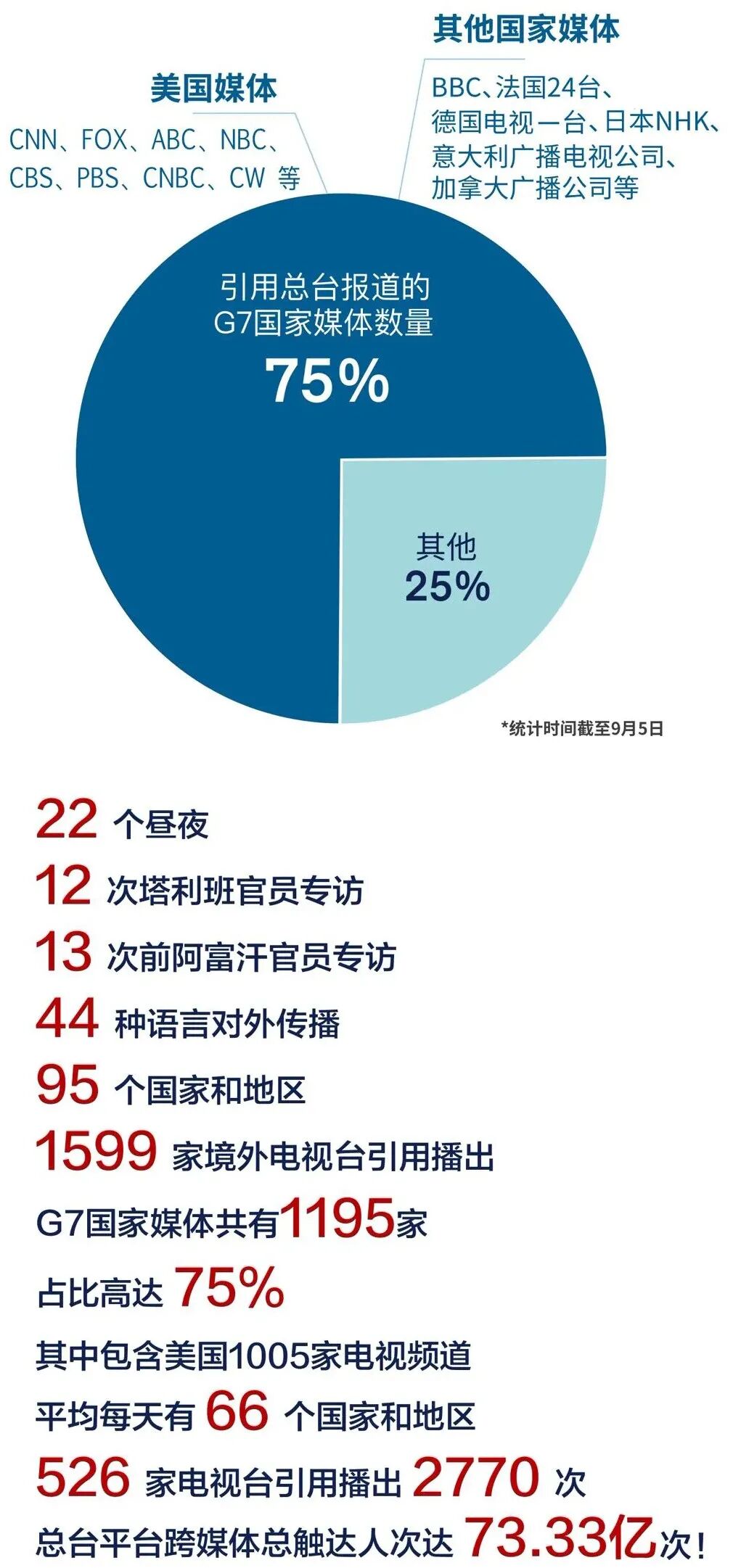 “闻风而动挺进动荡阿富汗,权威声音引领国际舆论场。8月31日塔利班新闻发布会,CGTN作为台上唯一的媒体话筒挺立中间!连阿富汗媒体的话筒也未被准许放上。”“这是国际媒体的一次正面较量。BBC、CNN、FOX、CNBC、美联社、路透社、法新社、德国电视一台、法国24台、俄罗斯RT、日本NHK……国际主流媒体群起转发,总台报道成为全球信源,冲破西方媒体对重大国际新闻的垄断,扭转中国媒体长期充当‘二传手’的局面。”