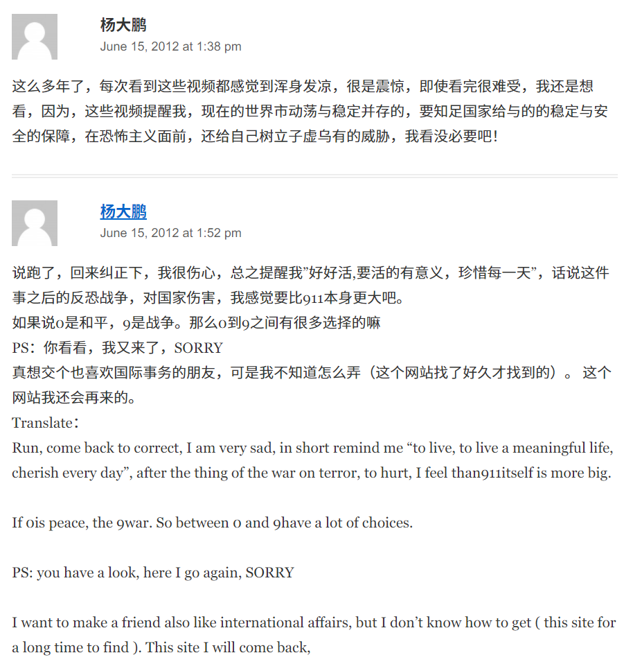 在当时的中国,也有一少部分人有机会从西方媒体的报道角度看待9/11事件。他们可以是占全国人口仅2%的网民,可以是所在城市有涉外宾馆,又通过小道消息知道有凤凰台的人,可以是英文好的在校大学生、归国留学生。这一小部分人当中存在大量后来成为国家“精英”阶层,进入文化传播领域的专业人士,他们对9/11的看法是以悲天悯人,而不是拍手称快为主,也就当然可以理解。