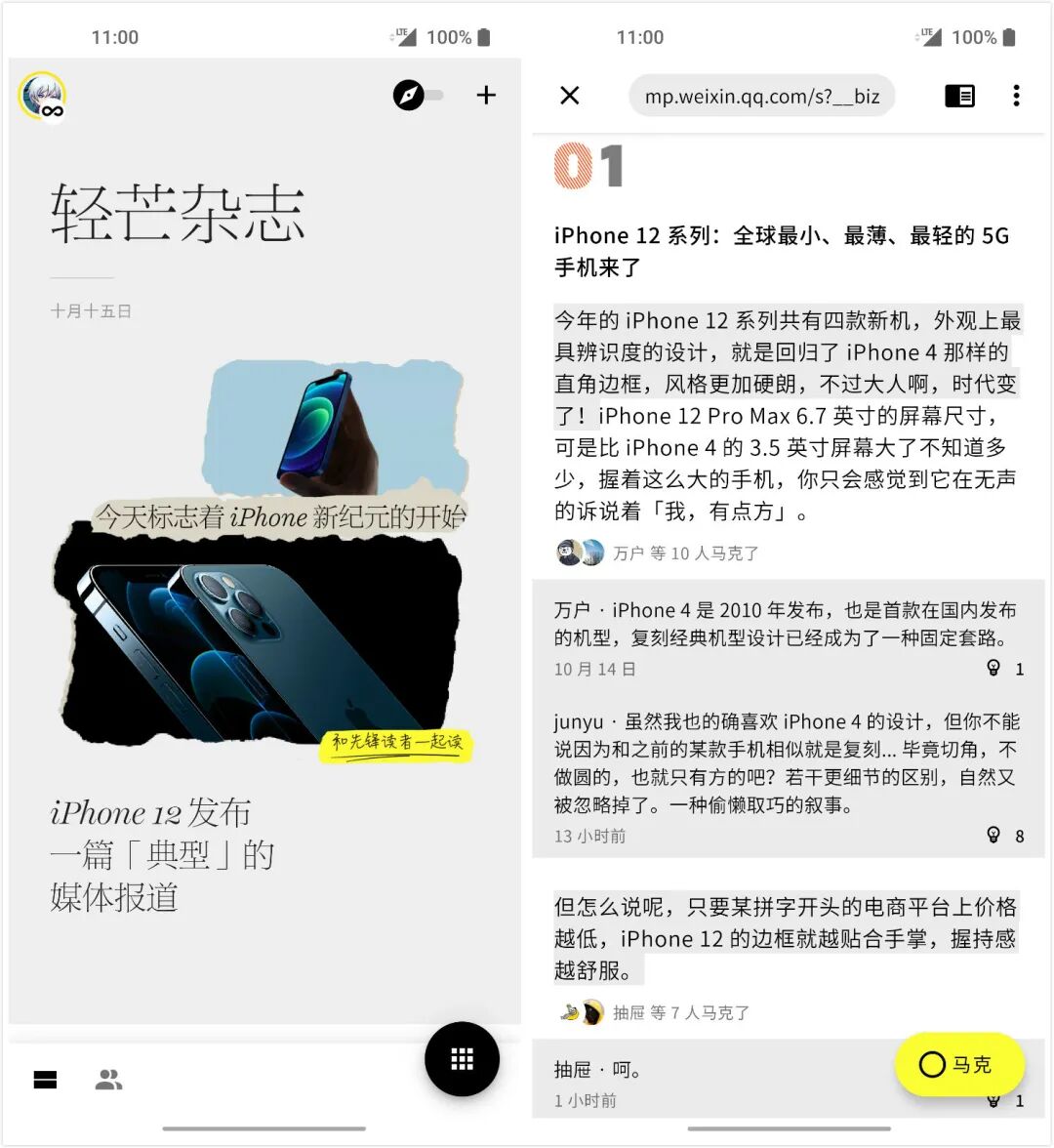 轻芒 APP 遵循了人的直觉,将标记动作简化到了极致,只需要手指长按文字即可。轻芒将转发和评论的最小单位,由单篇文章进一步下探到文章里的某一两句话,这使得它评论区的结构是开放社区类产品中最复杂的。
