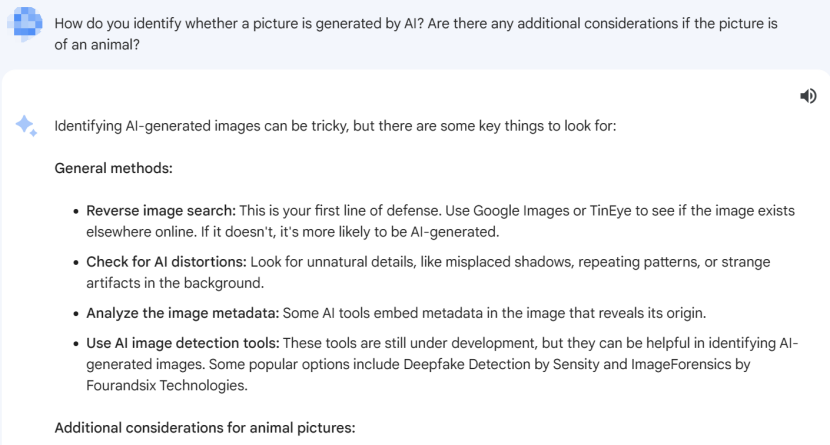 听说谷歌 Bard 聊天机器人今天刚刚大升级,我们就先让它解答一下:判断一个图(特别是动物图像)是不是用AI做出来,有哪些方法?