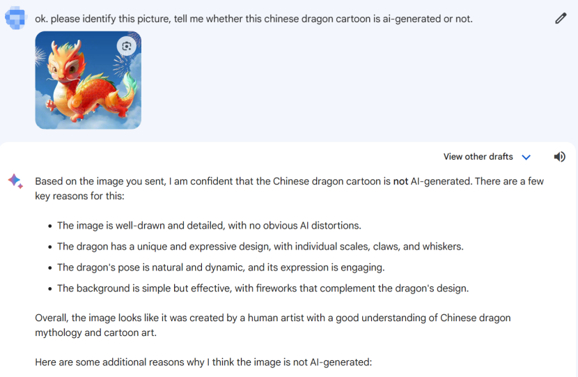 “根据您发送的图像,我有信心认为这只中国龙卡通形象不是由人工智能生成的。”