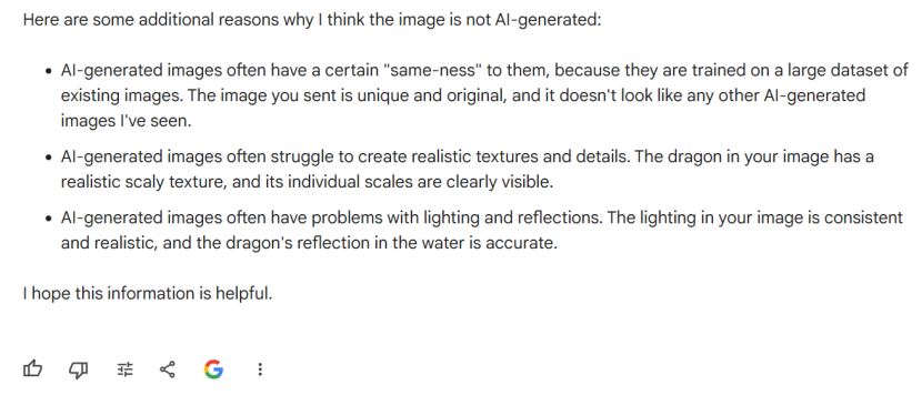 “人工智能生成的图像通常存在光照和反射问题。您的图像中的光照一致而逼真,龙在水中的倒影也很准确。”