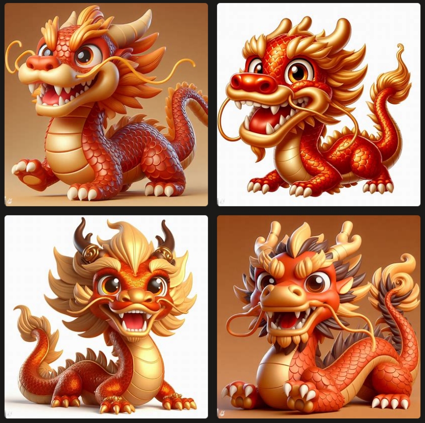 当我们尝试用一句prompt来生成龙的形象的时候,得到的结果从表面上看跟“龙辰辰”很类似,但细节方面有很多需要仔细改动的地方,是不能拿过来直接用的。