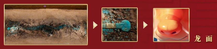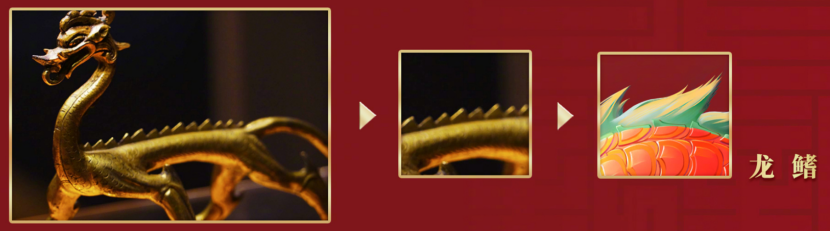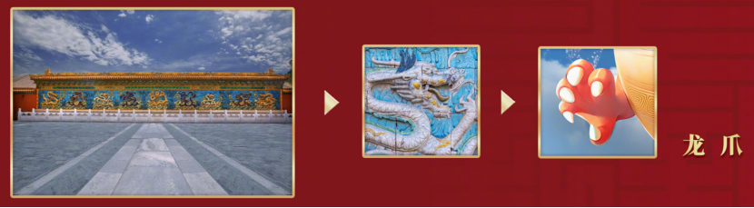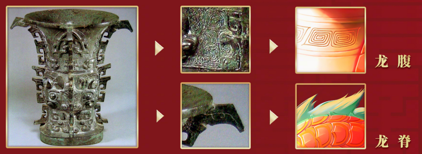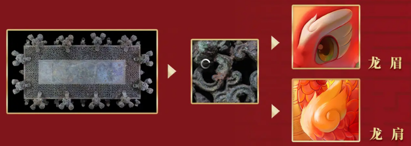 根据官方介绍,“龙辰辰”以中华民族龙图腾的代表性实物、出土于二里头遗址的绿松石龙形器筑龙面;取材首现“中国”二字的定源重器何尊,以云雷纹烙印龙腹、以扉棱雕刻龙脊;以云纹铜禁上展现古老失蜡法精湛工艺的浮雕透空云纹画龙眉、龙肩;以唐鎏金走龙挺拔雄健的背脊为昂首前行的龙鳍。