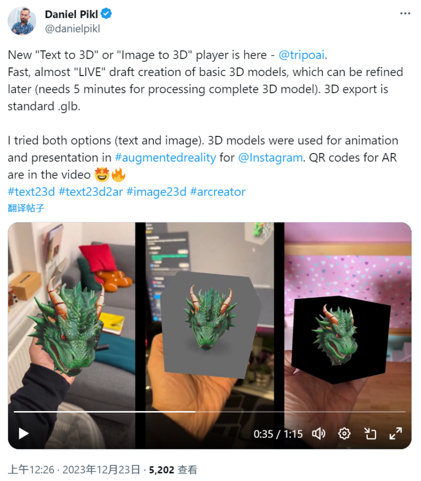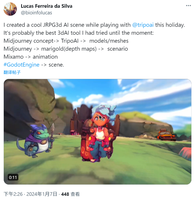 在海外社交媒体上,发布不到20天,Tripo的生态开发者就已经用AI生成的3D模型在引擎里做JRPG3D、AR等等各种实验性尝试,这是全新内容社区的雏形。