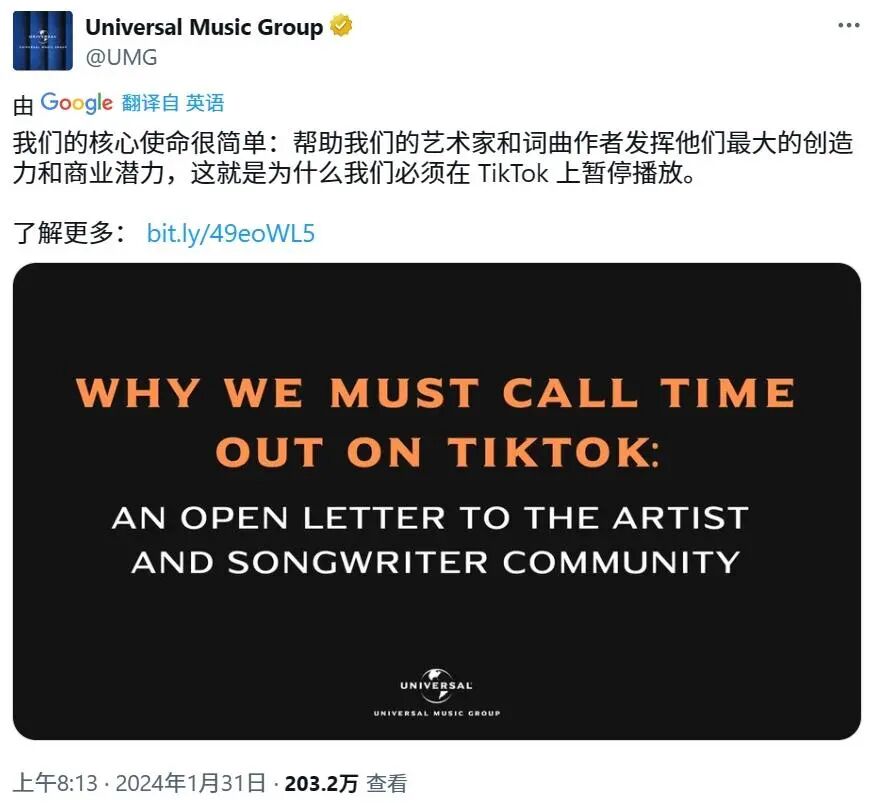 今年1月,环球音乐和TikTok爆发版权纠纷