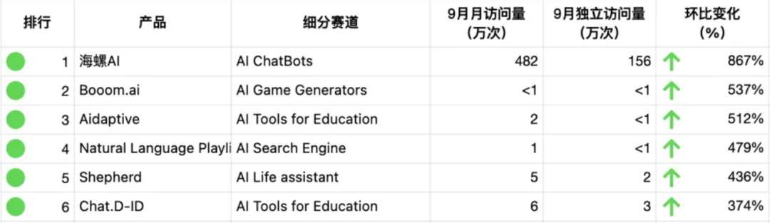 2024年10月,海螺AI进一步推出了图生视频功能。在VBench的第三方独立测试中,海螺AI在综合排名中位列第一,特别在画面质量、连贯性、流畅性等多个维度上处于领先地位。官网9月访问量在AI产品榜的全球和国内增速榜均排名第一,增速高达 867%。