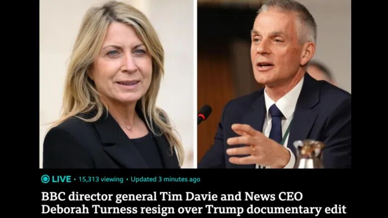 11月9日,BBC总裁蒂姆·戴维(Tim Davie)与新闻CEO德博拉·特尼斯(Deborah Turness)双双宣布辞职。