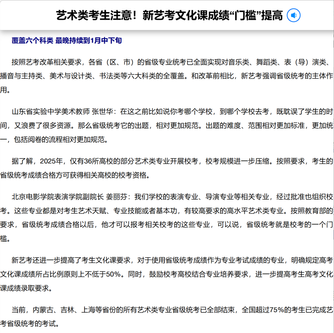 [1] 新华网:艺术类考生注意!新艺考文化课成绩“门槛”提高 https://www.news.cn/edu/20241218/cadb9018063a47a3a3f96a271770a4ab/c.html
