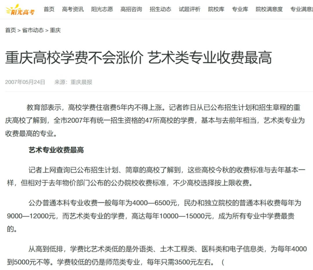 [4] 在2007年的重庆,公办普通本科专业收费一般每年为4000-6500元,民办和独立院校的普通本科收费每年为9000-12000元,而艺术类专业的学费,高达每年10000-15000元,成为所有专业中学费最贵的。 https://gaokao.chsi.com.cn/gkxx/cq/200705/20070524/911468.html