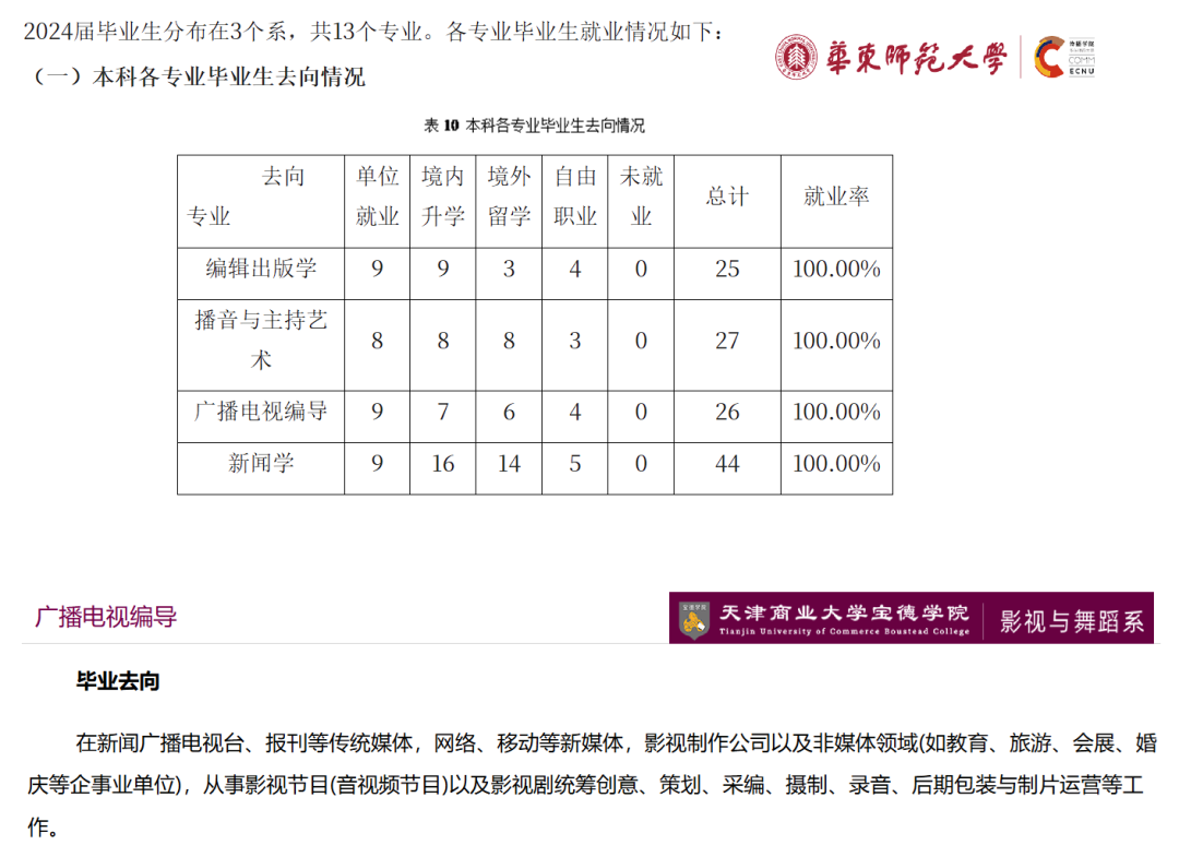 [5] 华东师范大学传播学院 2024 届毕业生就业质量报告显示,广播电视编导本科毕业生的去向分布是:单位就业 9 人、境内升学 7 人、境外留学 6 人、自由职业 4 人,共 26 人。 https://comm.ecnu.edu.cn/3e/f5/c41509a671477/page.htm 天津商业大学宝德学院的专业介绍提到,广播电视编导毕业生可去新闻广播电视台、网络和移动新媒体、影视制作公司,以及教育、旅游、会展、婚庆等非媒体领域。 https://www.boustead.edu.cn/yswd/29142/ 一般来说,学校越是边缘,就业形势越困难,也越难以找到明确的公开数据。