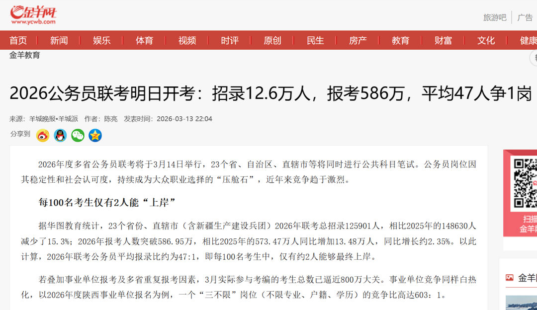 [8] 2026年联考公务员平均报录比约为47:1,即每100名考生中,仅有约2人能够最终上岸。以2026年度陕西事业单位报名为例,一个“三不限”岗位(不限专业、户籍、学历)的竞争比高达603:1。 https://edu.ycwb.com/2026-03/13/content_54007818.htm