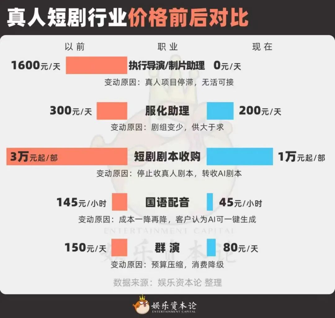 所以真人短剧方面,编剧的剧本收购价从3万元跌到1万元,配音价格从140元/小时被压到45元,甚至你要去当个群演,日薪也从150元腰斩至80元。[10]